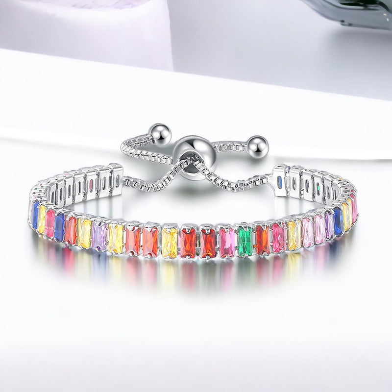 Designs & You Silver Plated Rectangular Cut CZ Multicolor Matrix Anti Tarnish Tennis Bracelet