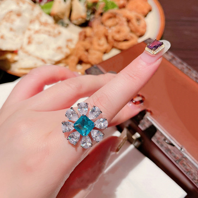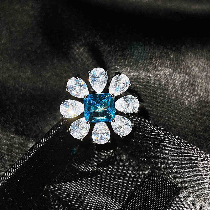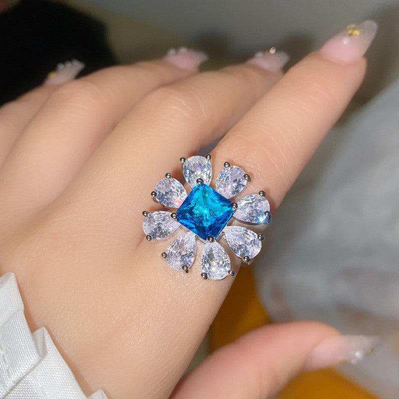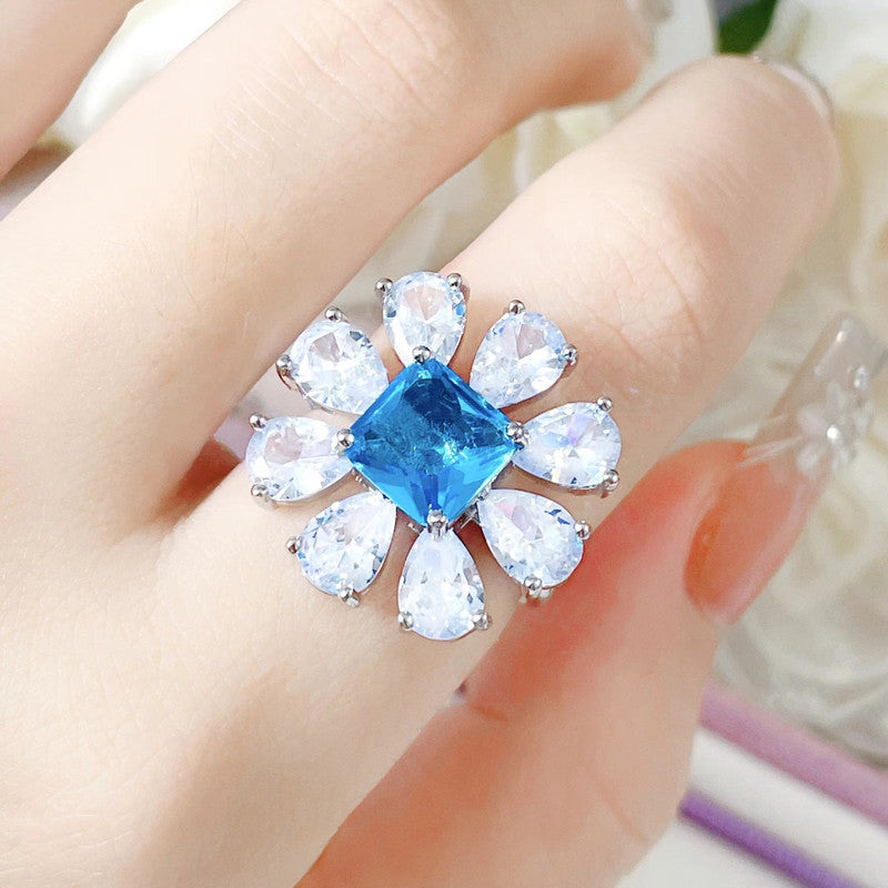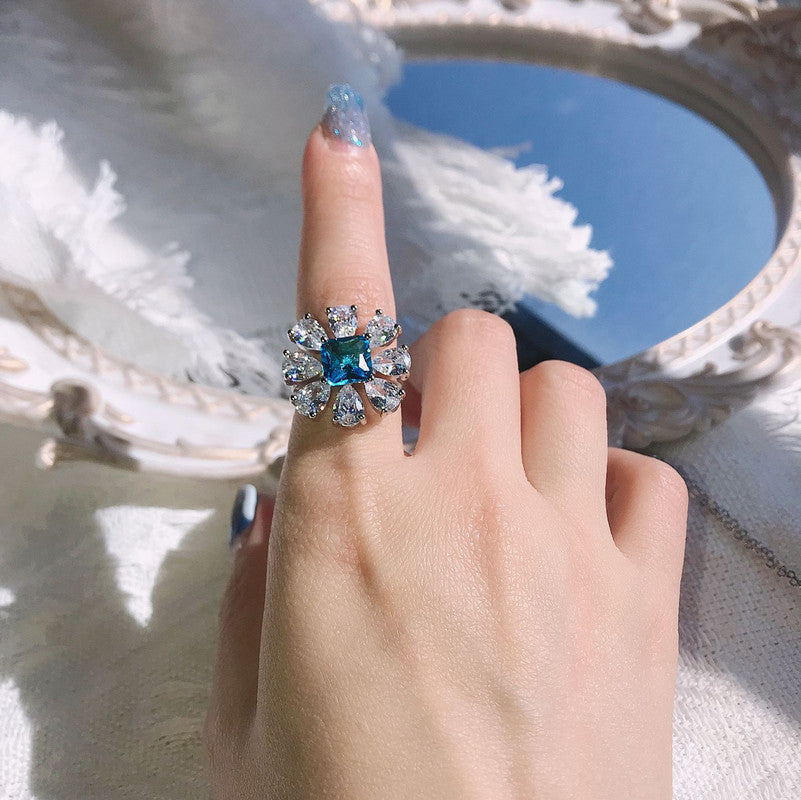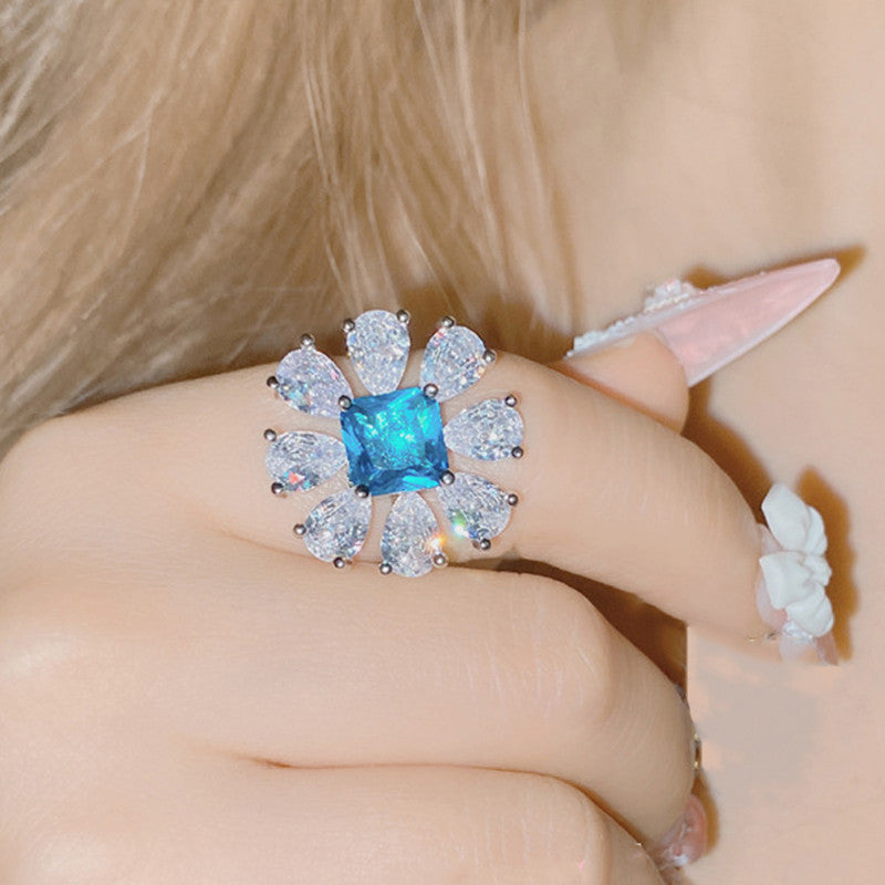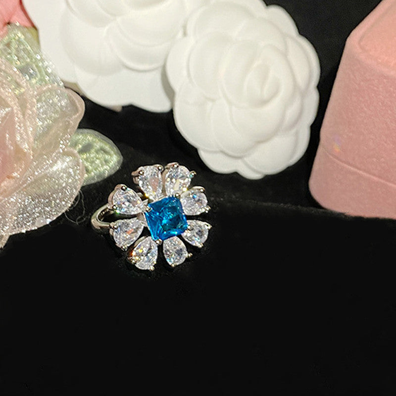 Designs & You Womens Blue Floral Silver Plated Cubic Zirconia Studded Adjustable Ring